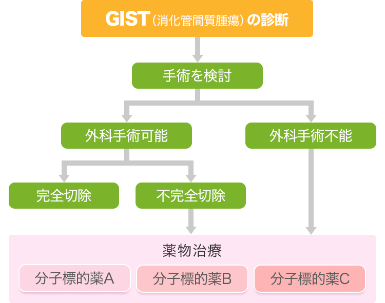 GIST Q&AGISTの治療法について教えてください GISTと診断された場合の治療の第一選択は外科手術となります。ただし、腫瘍が大きい場合や、周囲の臓器への浸潤や転移などの理由で手術ができないあるいは腫瘍を完全に切除しきれない場合には、「分子標的治療薬」という薬で治療します。この薬は、がんの増殖にかかわるたんぱくを狙って攻撃するため、正常な細胞に与えるダメージが少ないと言われています。 現在、「分子標的治療薬」としてGISTの患者さんに投与される薬には3種類あり、患者さんの状態に応じて推奨される薬の使い方が「GIST診療ガイドライン」※によって提示されています。 【出典】GIST診療ガイドライン(第3版2014年)「診療アルゴリズム」より作図 ※「診療ガイドライン」とは? 「GIST診療ガイドライン」は、日本癌治療学会・日本胃癌学会・GIST研究会により作成されています。 監修:藤田医科大学病院 臨床腫瘍科 准教授 澤木 明 先生 更新年月:2022年11月 ONC46M001A Q&A TOPへ戻る